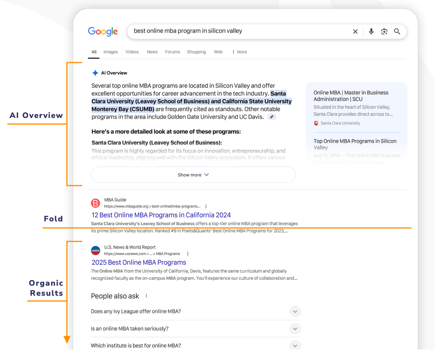 Mécanisme de sourcing : Google AI Overviews privilégie le contenu structuré (listes, tableaux, FAQ) et récompense la haute autorité du nom de domaine (d’où un avantage clair pour les plus grandes marques éducatives). De la sorte, Google fusionne sa compréhension traditionnelle du SEO avec les capacités d’IA générative.