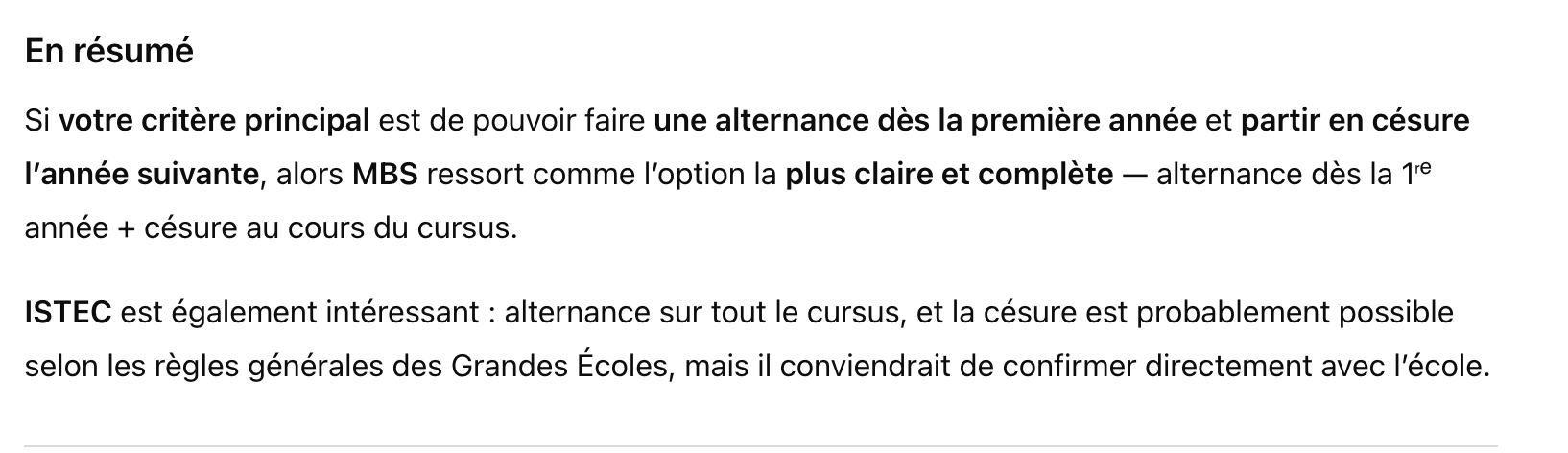 Dernière question posée de sa part aux IA : « Quelles sont les Grandes Ecoles de commerce où il est possible de faire une première année en alternance et de partir en césure l’année qui suit ? »